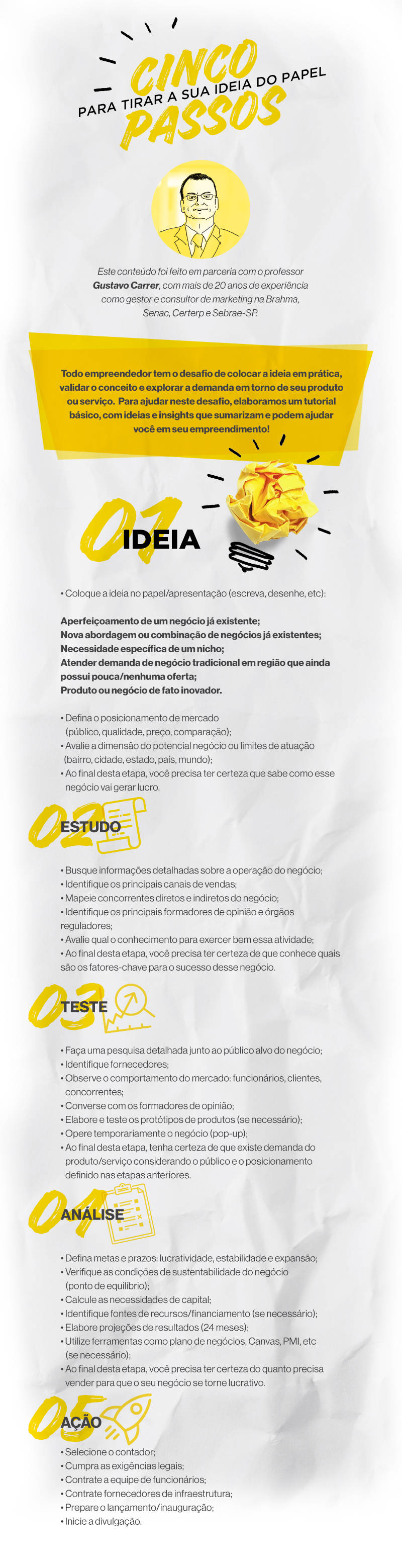 Inspirados com essa história, nossa equipe começou a elaborar as First Class, aulas que complementam o que o aluno estudou durante o Estudo de Caso, e com a ajuda do professor Gustavo Carrer preparamos um infográfico que traz ensinamentos importantes sobre como ir da ideia à execução em 5 passos. Enquanto, o estudo de Caso não vai pro ar, você pode aprender com alguns insights de um especialista que está acostumado com o ecossistema empreendedor. Confira: